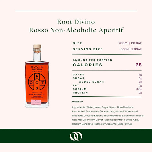 ROOTS DIVINO est un vermouth sans alcool. Un apéritif artisanal à 0% élaboré à partir de vin (di vino) puis infusé et macéré avec de l’orange amère, de la gentiane et de l’absinthe.